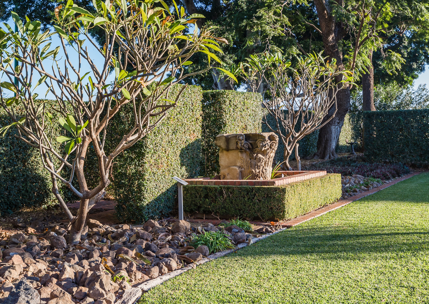 You’ll stumble across long standing Moreton Bay Figs, Hoop Pines, a Silky Oak and a Macadamia Nut Tree, plus Jacarandas, Queen Palms, a fountain, grape vines, and many a flower bed, just to name a few.